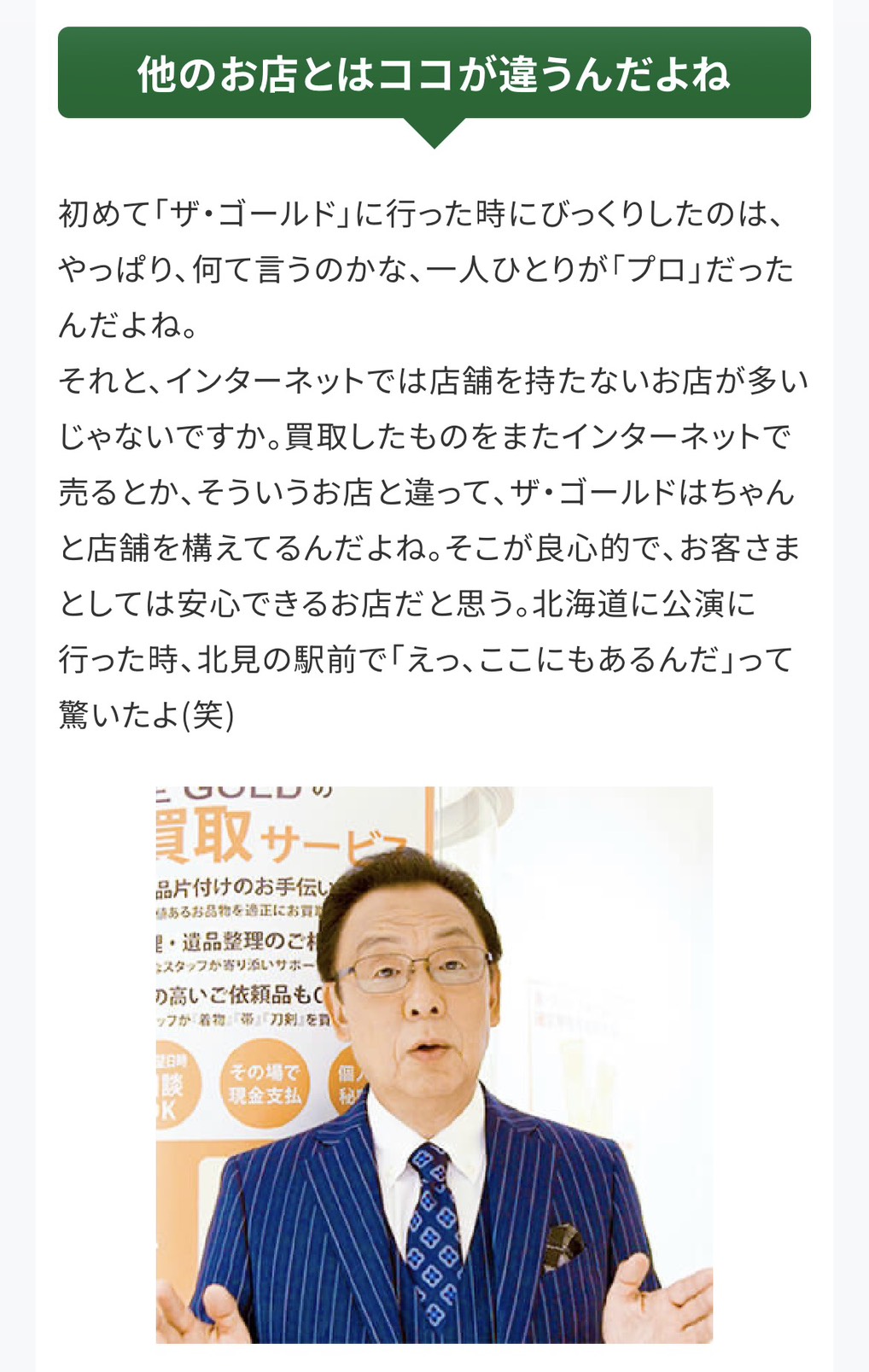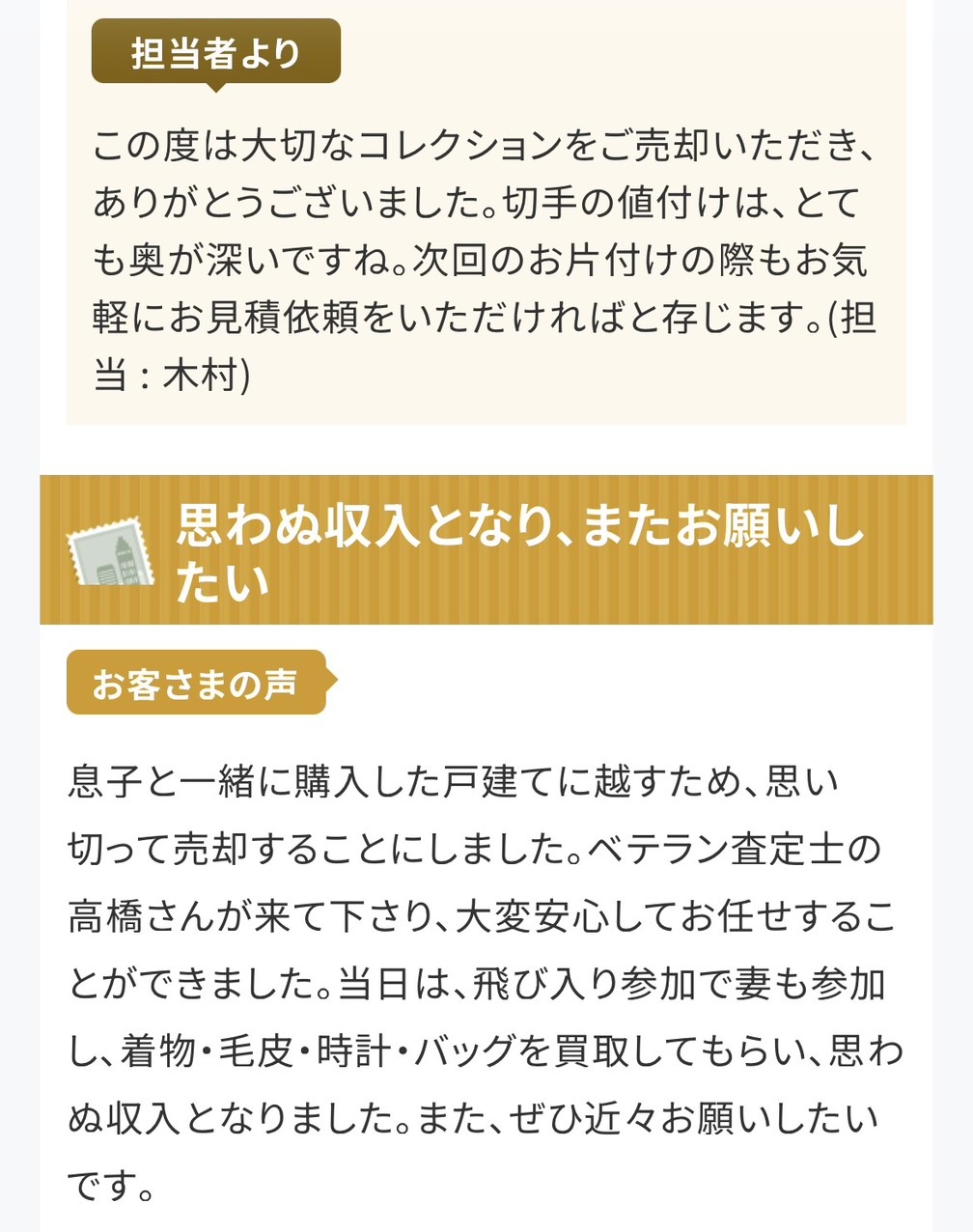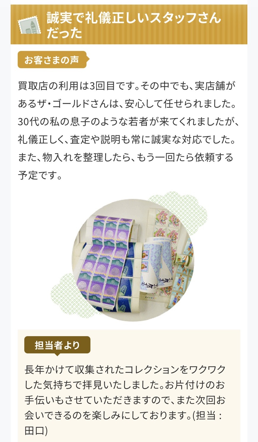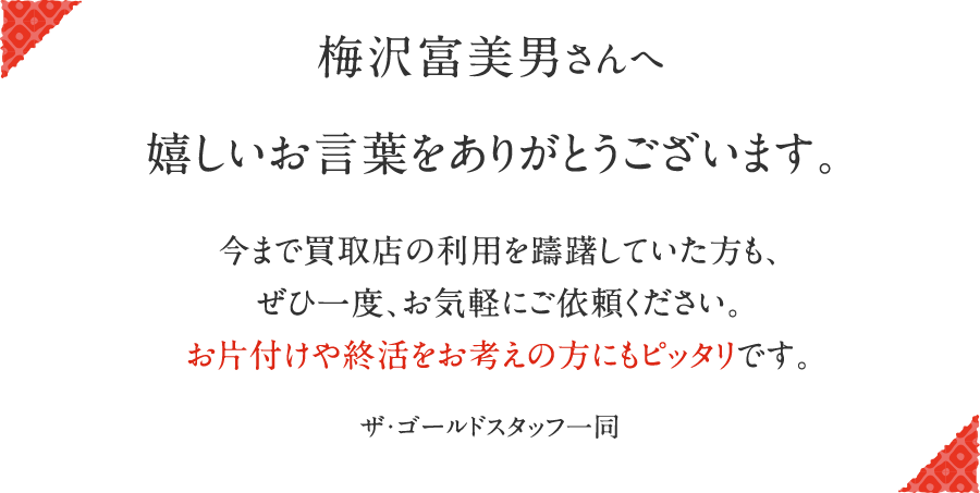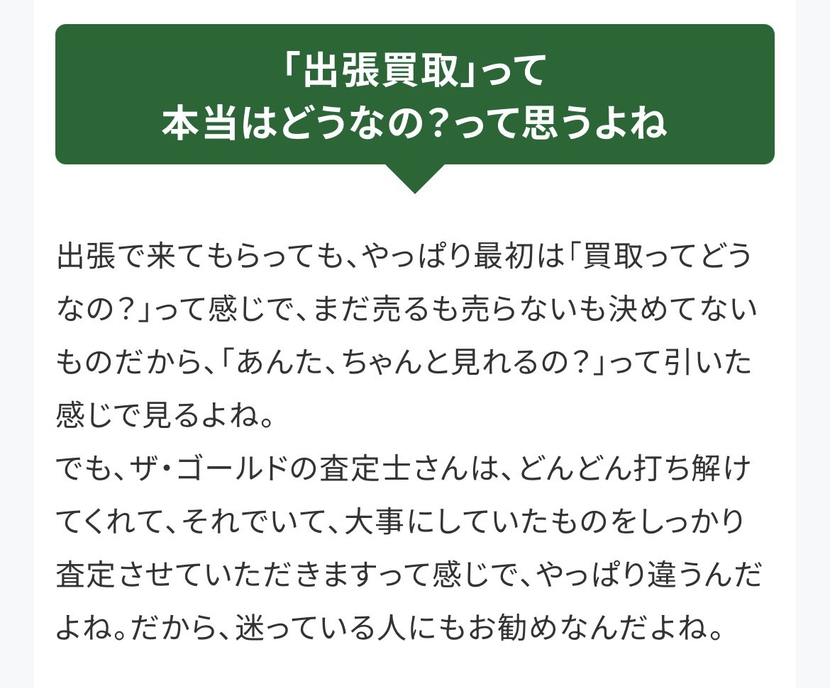 実際に梅沢さん自身がザ・ゴールドで買い取りしてもらった上で満足されてるようで、説得力ありますね。見積もり後の売却判断も自由だしキャンセルもOK。強引な営業も無いので安心して見積もりが貰えます。