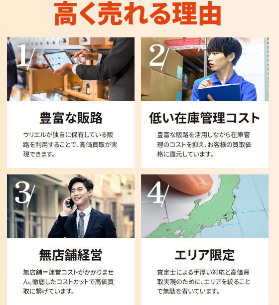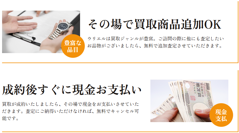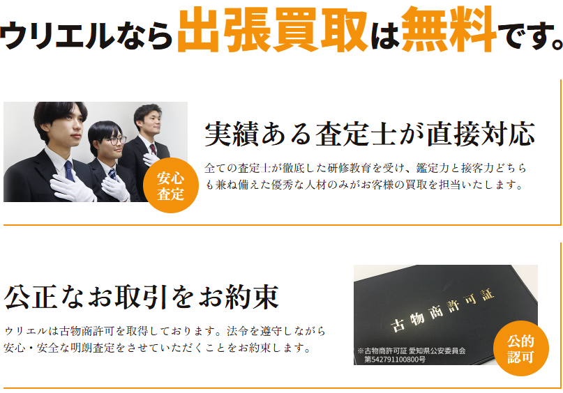 出張エリアを絞って出張専門で店舗を持たないからこそ、本来かかる経費を削減して売主に還元してくれるから高価買取です。出張可能地域の方にしたらウリエルが1位といっても過言ではありません。