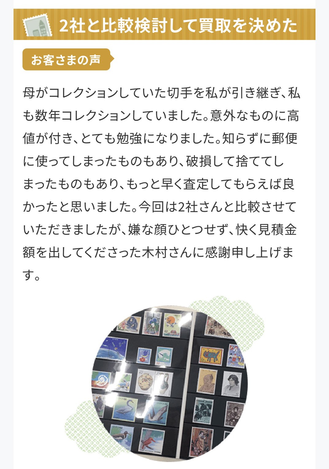 多くの買取業者を調べた結果 ・バラ切手可 ・見積もりだけで断ってOK この5つを満たした上で、 査定額、専門性、対応の姿勢を基準にしたところ、信頼できる業者を2社まで絞り込みました。 |